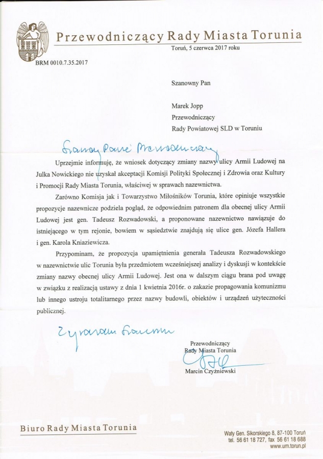 Szef SLD w Toruniu Marek Jopp otrzymał pismo od Przewodniczącego Rady Miasta Torunia z informacją, że miejskie komisje nie zaakceptowały na patrona dekomunizowanej ulicy Armii Ludowej - Julka Nowickiego.