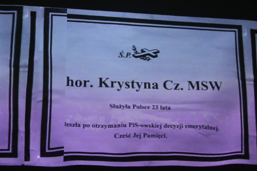 Nawiązuje on do desperackiej śmierci w tym samobójstw 58 funkcjonariuszy służb mundurowych z okresu PRL, a w wielu wypadkach nawet kilku czy kilkunastu lat ich pracy już w wolnej Polsce. Odebrali sobie życie, lub zmarli na skutek załamania psychicznego po wprowadzeniu przez władze PiS ustawy obniżającej do minimum emerytury wszystkim pracownikom tych służb czyli ponad 50 tysiącom osób. Dla niektórych była protestem dyktowanym honorem i godnością. Nastąpiło to na podstawie zastosowania zbiorowej odpowiedzialności czyli legislacyjnego bezprawia. Filmowy dokument podaje przykłady ofiar zatrudnionych nie tylko w organach bezpieczeństwa czy milicji lecz także straży granicznej czy osób będących zwykłymi urzędnikami w służbach mundurowych. Rządzący, w tym prezydent Andrzej Duda podczas ostatniej kampanii wyborczej nazywali ,,Ustawę śmierci” aktem sprawiedliwości,, za służbę obcemu mocarstwu”.